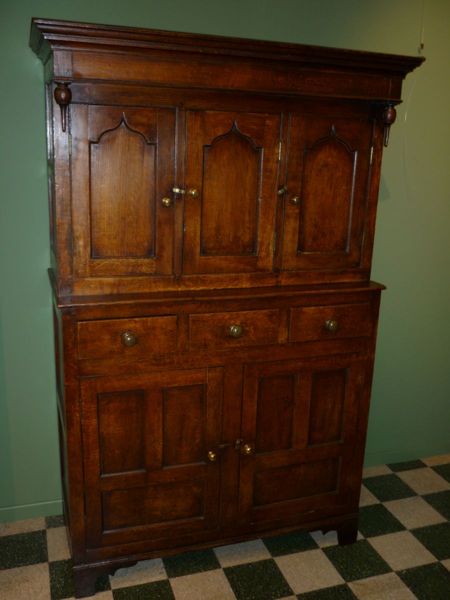Buffet à deux corps du Pays de Galles dit 'Due Darn', ouvrant à trois petits vantaux moulurés d'un motif en accolade, trois tiroirs au milieu, et deux grands vantaux avec pannneaux, reposant sur des pieds en console. En chêne.