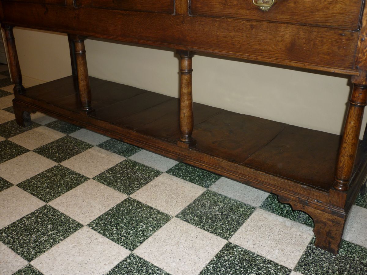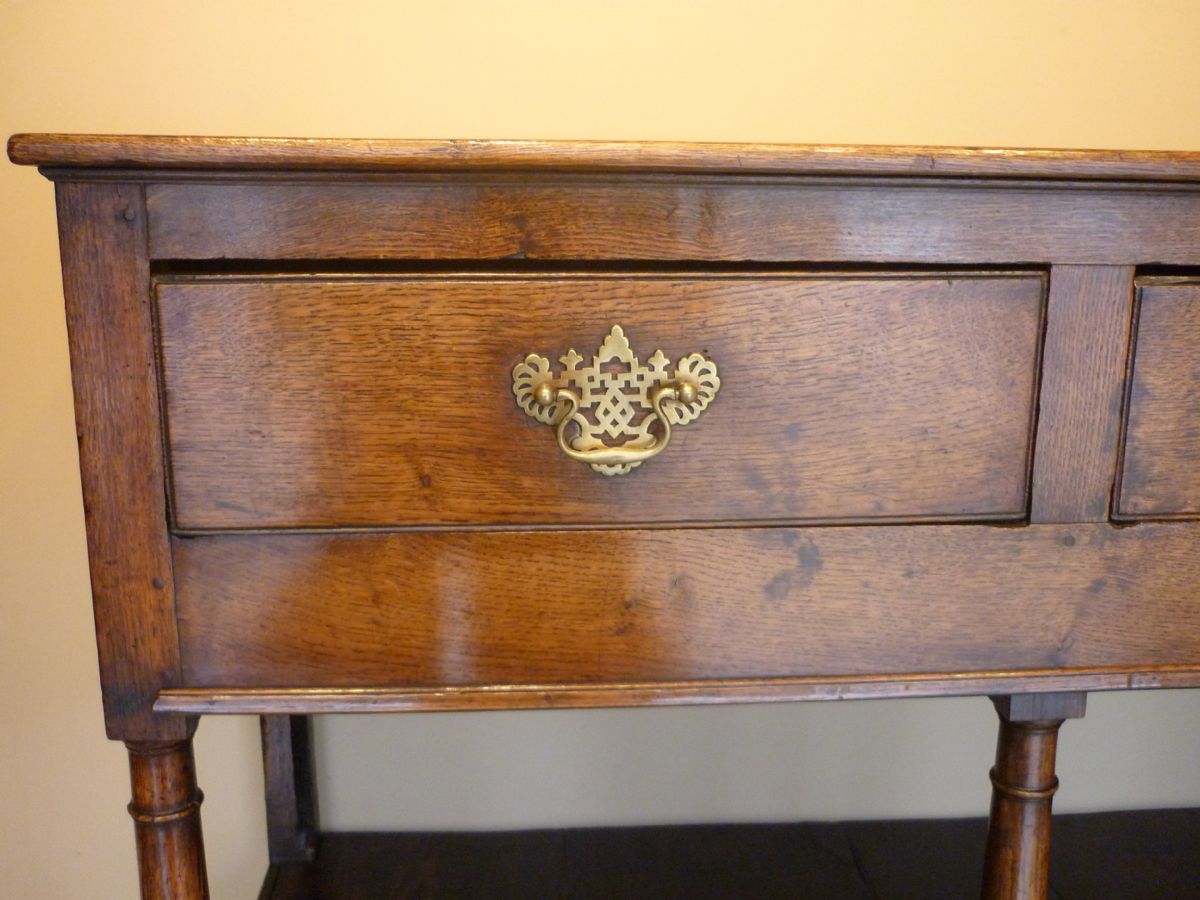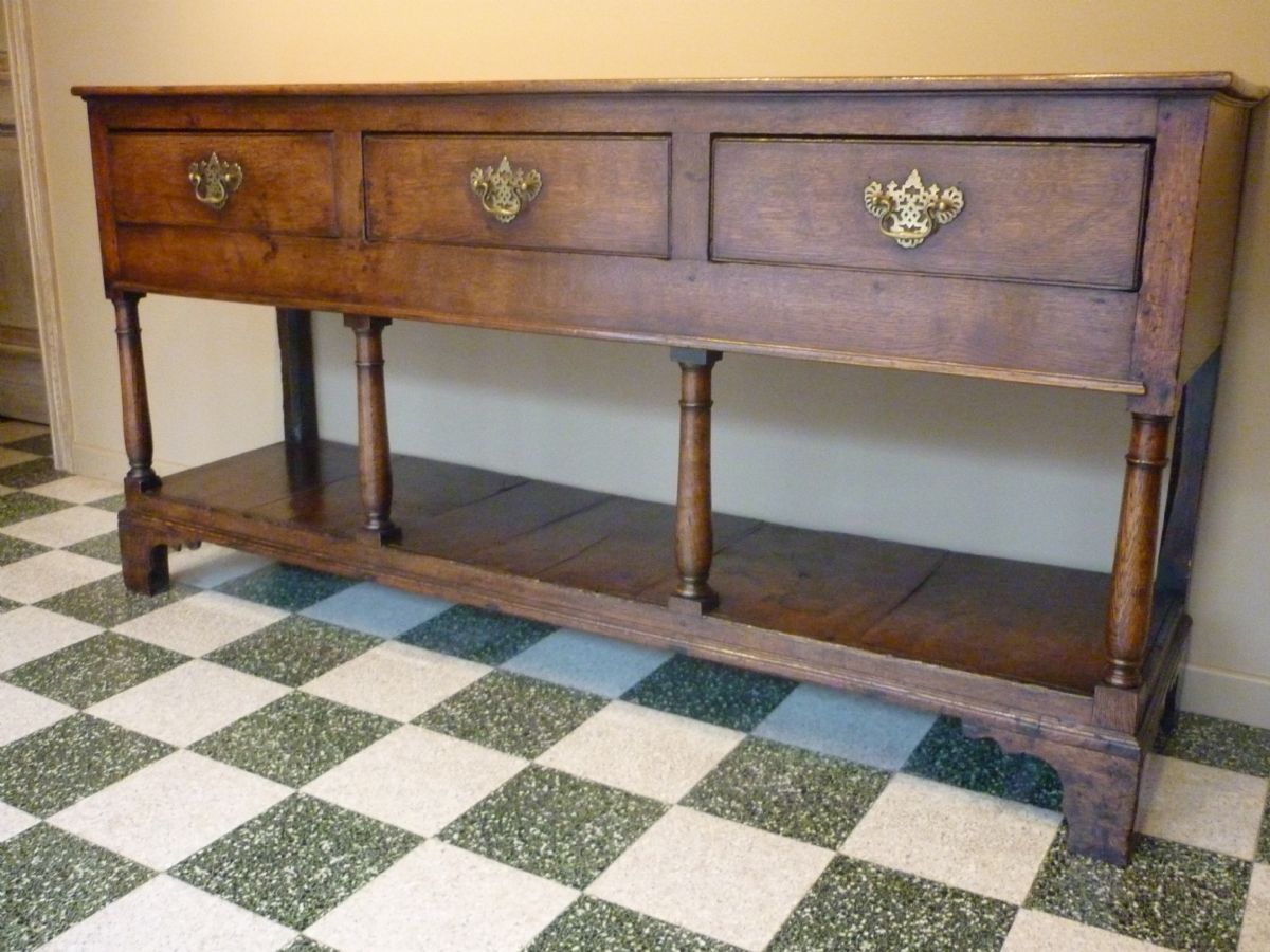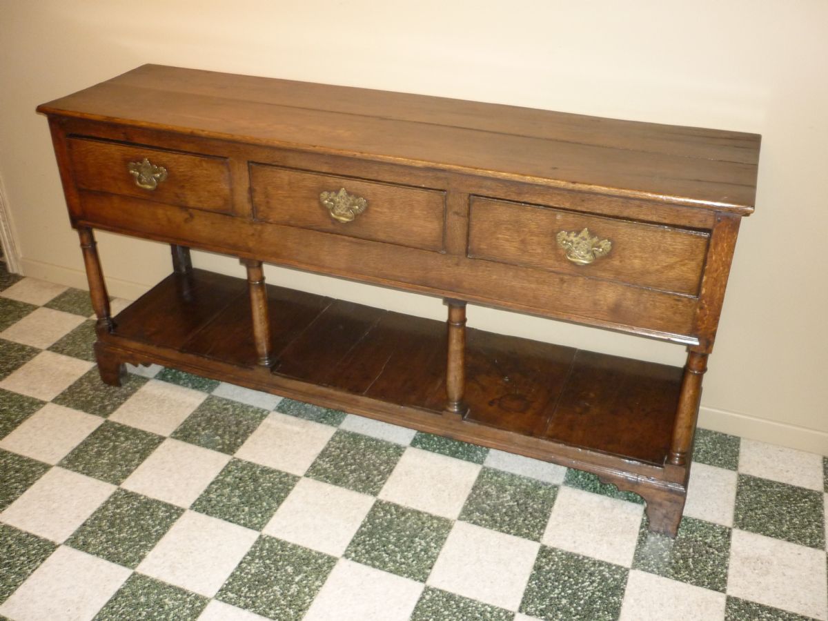 Dressoir anglais en chêne, avec 3 tiroirs avec poignées de tirage en cuivre en col de cygne et platine de support ajourée. Sur une base moulurée s’élèvent 4 colonnes, au fût galbé, elles supportent les montants des tiroirs. Le meuble repose sur des pieds en console.