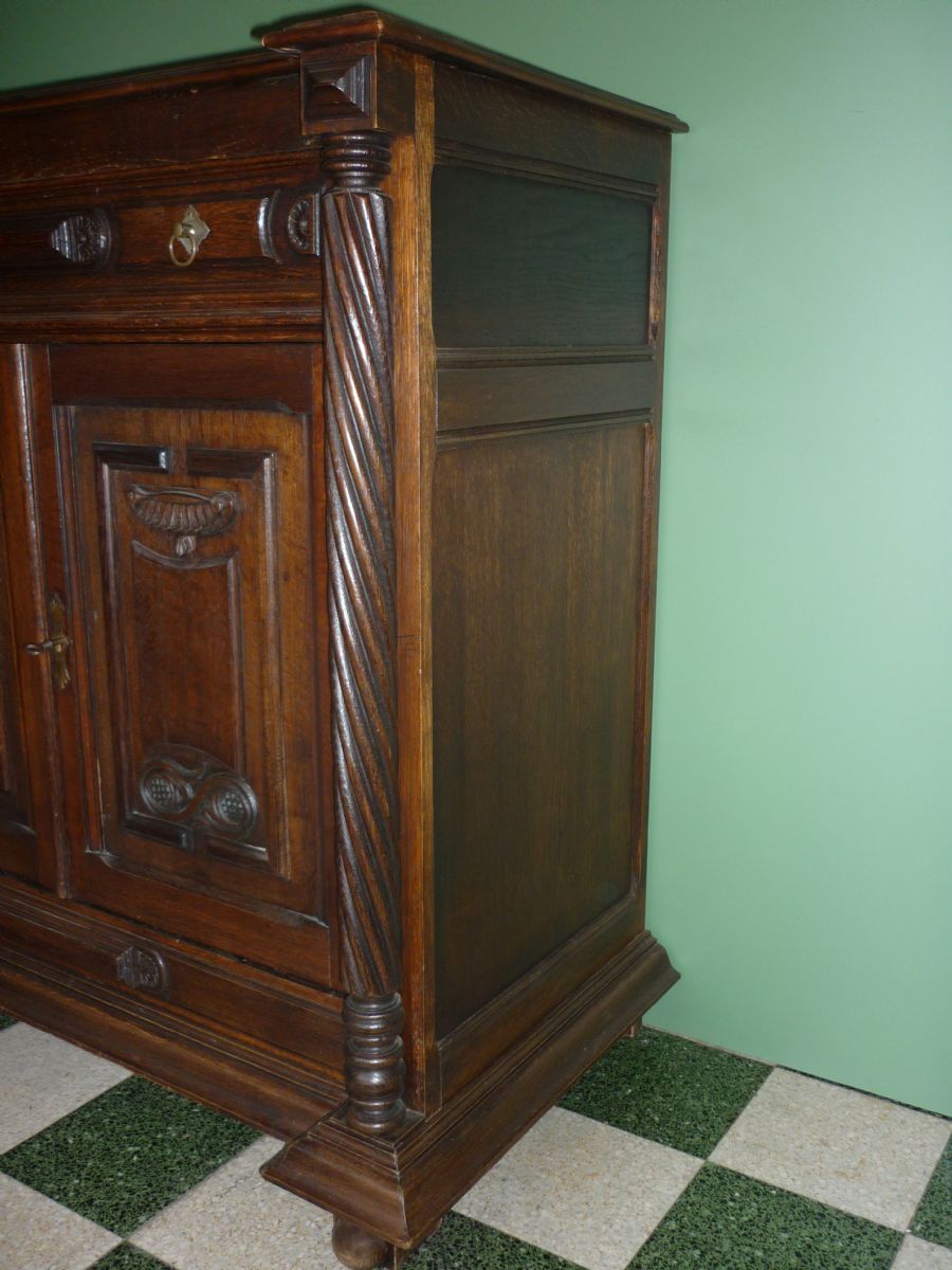 Buffet en bois sculpté de style Renaissance aux montants torsadés, un tiroir et deux portes panneautées ornés de profils sculptés en bas-relief. Les colonnes torsadés renforcent la verticalité du meuble et confèrent à l'ensemble une grande élégance. Il repose sur une plinthe basse moulurée posée sur pied pastille.